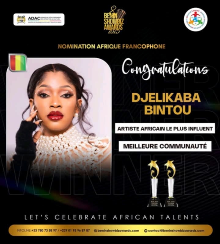 L’ascension de Djelykaba Bintou Kouyaté franchit une nouvelle étape décisive. La star guinéenne vient de s’illustrer avec éclat lors de la 8e édition des Bénin Showbiz Awards, confirmant son statut d’icône incontournable sur l’échiquier continental. La BMW de la musique guinéenne a su s’imposer face à une concurrence de haut vol.